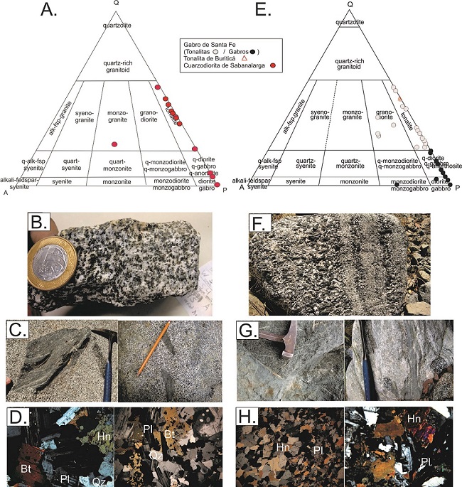 El Gabro de Santa Fe está compuesto por dioritas hornblendicas, microdioritas, gabros y tonalitas hornblendicas (Figura 3E y 3F); y está rodeado por abundantes xenolitos de anfibolitas de la Granulita de Pantanillo (Rodríguez et al., 2012b) y basaltos de la Fm. Barroso (Figura 3G). Para el análisis de esta otra unidad se consideraron 40 secciones delgadas que caen entre el campo de gabros (facie máfica) y tonalitas (facie intermedia) (Figura 3E); asi cuatro muestras correspondientes a tonalitas para el Stock de Buriticá (Figura 3E). En general, las muestras revisadas presentan textura hipidiomórfica con presencia de plagioclasa, hornblenda, ± piroxeno y cuarzo, como accesorio, y sausurita y calcita, como minerales de alteración (Figura 3H). La Tonalita de Buriticá está compuesta principalmente por cuarzo y plagioclasa (Giraldo, 2017).