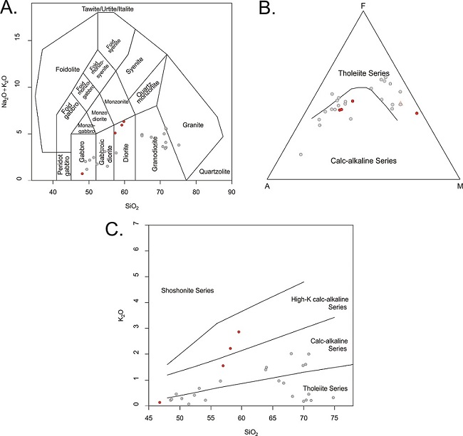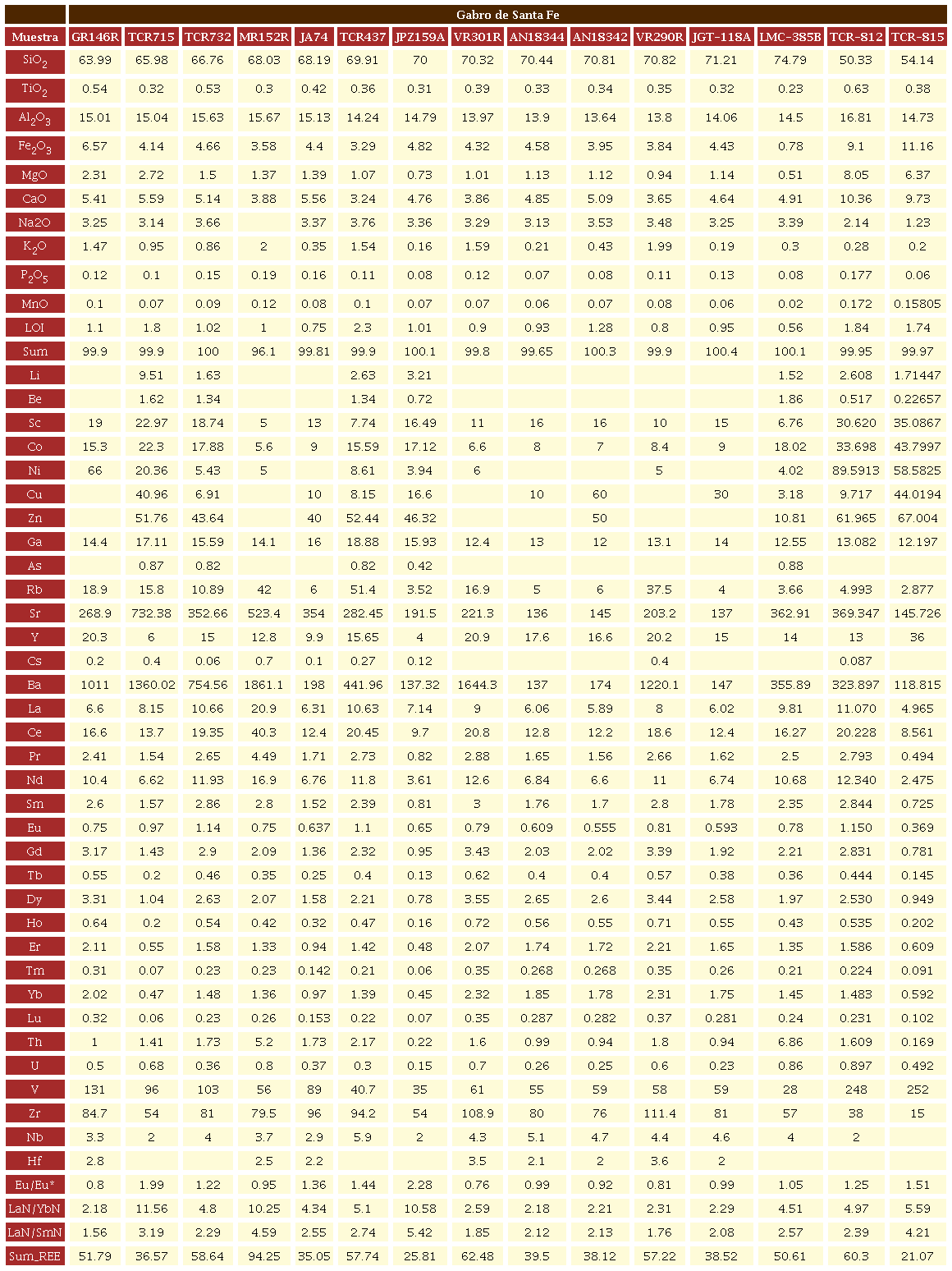 Para las muestras del Gabro de Santa Fe, el contenido de SiO2 varía entre 74.7-48.6 %; el de Al2O3, varía entre 0.78 a 13.2 %; el de MgO, varía entre 0.5-9.76 %, Na2O= 0.86-3.76 %; y el de K2O, varía entre 0.2 hasta 1.4 %; presentando valores de Sr=151-732 ppm, Y=7-20.9 ppm y razones Sr/Y =9-122 y La/Yb=2.08-7.6 afines con algunas características adakíticas (Kay and Kay, 2002). En el diagrama TAS (Middlemost, 1994), las muestras caen en el campo de los gabros, gabrodioritas, dioritas y granitos (Figura 4A); en el diagrama AFM (Irvine y Baragar, 1971), las muestras se distribuyen en dos grupos bien definidos en la figura 4b entre muestras de las series calco-alcalinas (muestras intermedias) y las series toleíticas (muestras máficas). Por último, en el diagrama de SiO2 vs K2O (Peccerillo y Taylor, 1976), las muestras se distribuyen igualmente entre dos grupos, entre las series toleíticas y las series calcoalcalinas (Figura 4C).