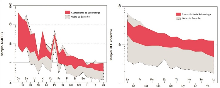Las muestras de la Cuarzodiorita de Sabanalarga normalizadas al N-MORB (Sun y McDonough, 1989), presentan enriquecimiento en "Large Ion Lithophile elements" (LILE). En comparación con los "High Field Strength elements" HFSE y las tierras raras (REEs), con anomalías negativas de Ta, Nb-Ti y enriquecimientos en Cs, Ba y K (Figura 5A), características de magmas formados en una zona de subducción. Normalizadas al Condrito (Nakamura, 1974), las muestras presentan enriquecimiento en tierras raras livianas respecto a las tierras raras pesadas, con razones (La/Yb)N=3.0-3.96 y (La/Sm)N=2.85-2.27 (Figura 5B).