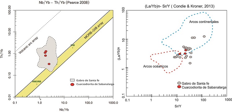 En el diagrama de clasificación Nb/Yb-Th/Yb (Pearce, 2008) se observa que tanto las muestras de la Cuarzodiorita de Sabanalarga y el Gabro de Santa Fe presentan enriquecimiento en Th y Nb (Figura 6A), característico de magmas sometidos a proceso de interacción con corteza en ambientes de subducción (Pearce, 2008). En el diagrama de Condie y Kroner (2013), se observa que las muestras correspondientes a la Cuarzodiorita de Sabanalarga presentan altos valores (La/Yb)N vs Sr/Y, correspondientes a arcos continentales; mientras que las muestras del Gabro de Santa Fe se dispersan entre arcos oceánicos y arcos continentales (Figura 6B).