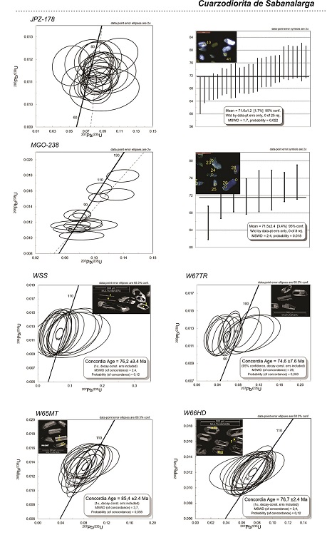 Los datos U-Pb obtenidos en este trabajo indican que ambos cuerpos cristalizaron en el Cretácico Superior. La Cuarzodiorita de Sabanalarga presenta dos grupos de edades, posiblemente correspondientes a dos pulsos: el más joven está entre 71.5 y 76.7 Ma (con una media ponderada de 72.8±2.9 Ma) y un dato más antiguo de 85 Ma. La morfología de cristales de circón (Giraldo, 2017) y los datos isotópicos 87Sr/86Sr=0.70379-0.70379 y εNd= +6.58 (Ordoñez-Carmona, 2001), permiten asociar este pulso al Stock de Altavista con 87Sr/86Sr= 0.70292, 0.70456, 0.70743 y εNd= + 7.4, +9.8, +2.6 (Correa et al., 2006).