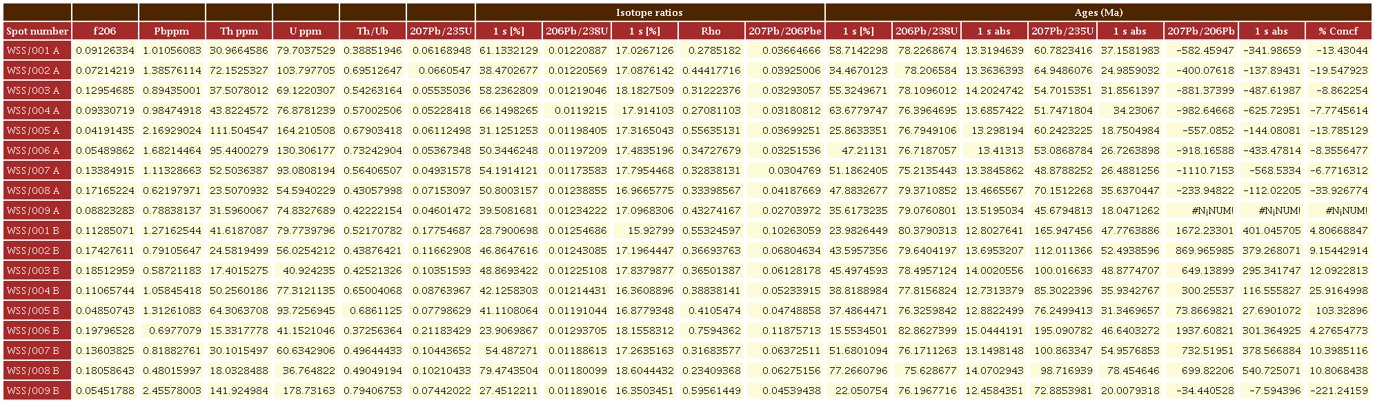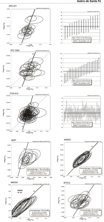 Para la muestra WSF (diorita), fueron analizados 18 granos con tamaño variable entre 50 y 200 µm y valores Th/U=0.61-0.31, típicos de circones magmáticos, (Figura 8). Esta muestra presentó circones ígneos euhedrales, con crecimiento oscilatorio, cristalizados sin núcleos heredados y una edad 206Pb/238U de 78.4±6.4 Ma (n=12) (Figura 8). La mayoría de los datos de este análisis fueron discordantes, debido principalmente a proporciones altas de 206Pb.