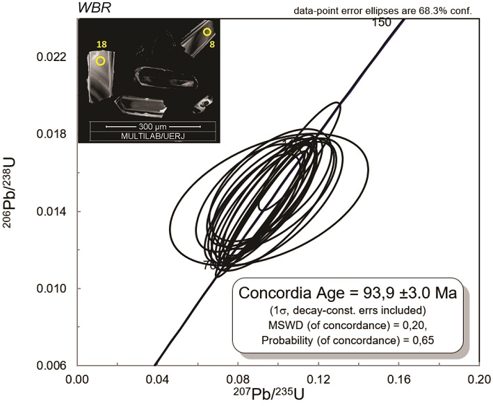 La muestra WBR (tonalita) presentó una edad 206Pb/238U, concordante de 93.9±3 Ma, con 18 granos analizados. Los granos son euhedrales, sin núcleos heredados y tamaños entre 100 y 500 μm y valores Th/U= 1.17-0.30 asociados a circones magmáticos (Rubatto, 2002; Figura 9). La edad obtenida fue menor, de la de 102 Ma reportada por Weber et al., (2015); pero consistentemente mayor con las obtenidas en el Gabro de Santa Fe.