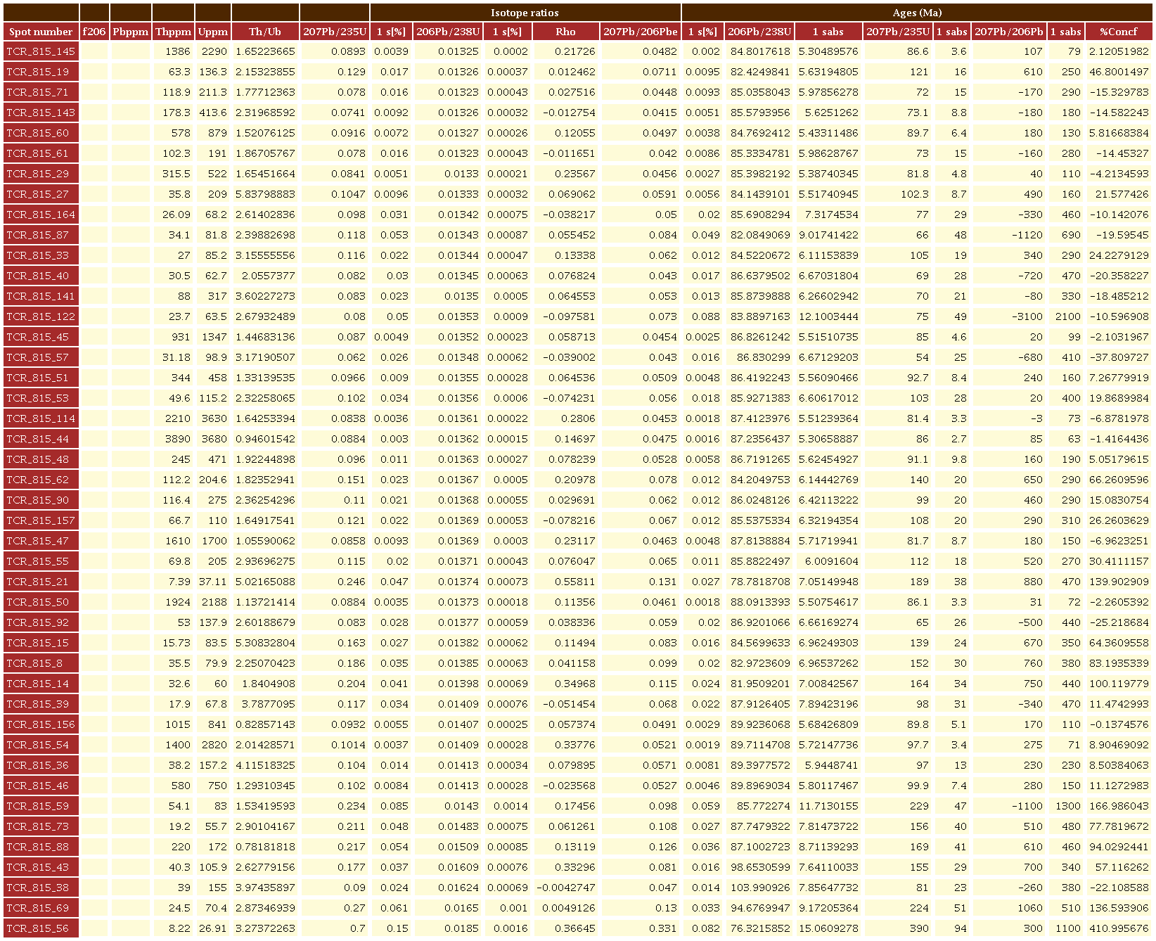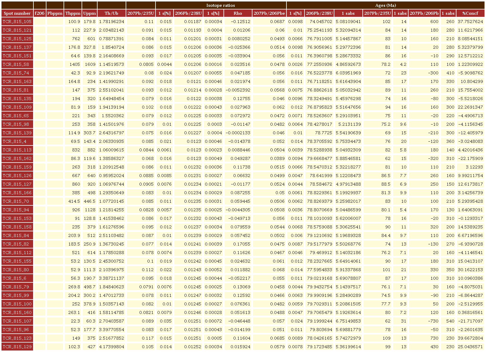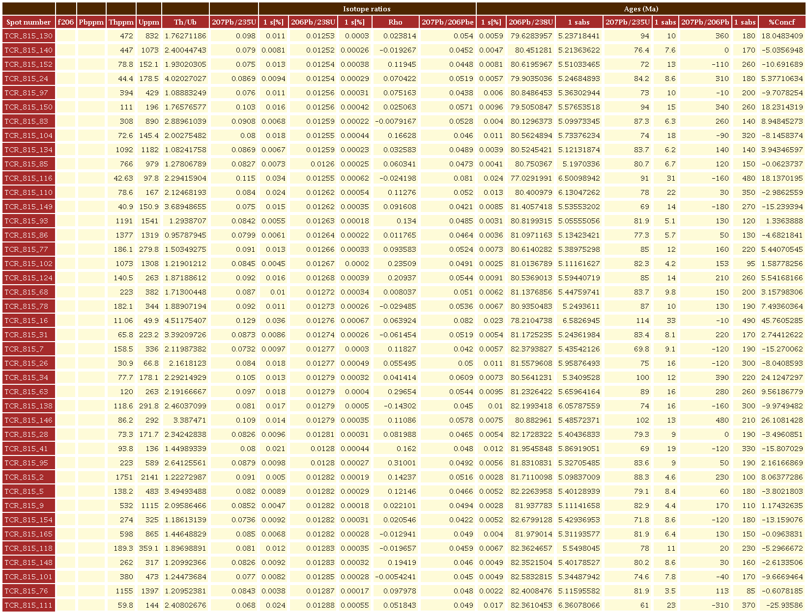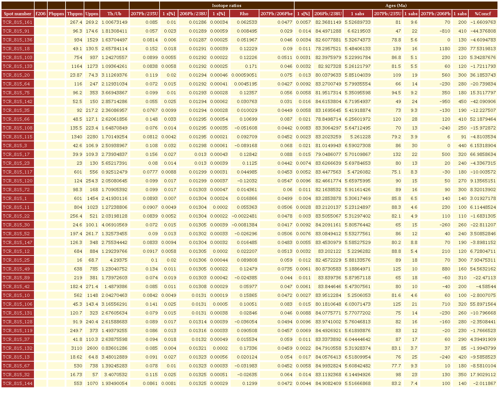 Para la muestra TCR-815 (microgabro), se analizaron 166 circones, subhedrales a anhedrales, rotos o como prismas cortos con tamaños entre 50 y 100 μm (Figura 8). En imágenes de CL los circones presentan zonación oscilatoria. El rango de la muestra varía de 76 a 89 Ma y son concordantes en el diagrama Tera Wasserburg (Figura 8). Finalmente, su edad fue calculada 206Pb/238U de 81.86±0.61 Ma (MSWD=1.18, n=92), y valores U/Th=0.3-1.21, valores típicos de circones ígneos (Rubatto, 2002).