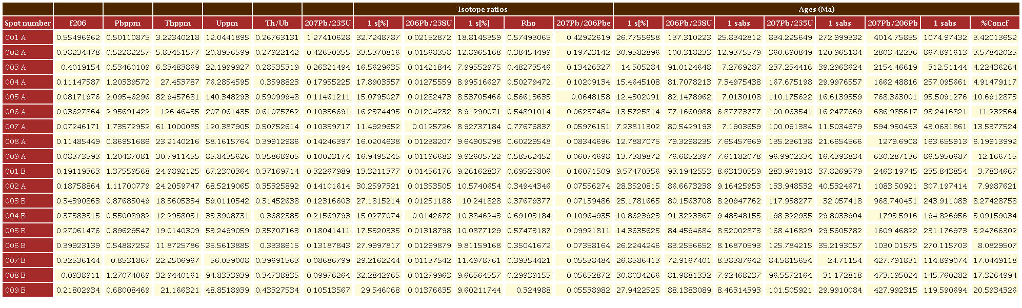 De los montajes de granos de circón se adquirieron imágenes de catodoluminiscencia (CL) por medio de luminoscopios. Los análisis isotópicos de las muestras se llevaron a cabo en el Laboratorio de Geocronología del Servicio Geológico Colombiano, siguiendo los procedimientos descritos en Peña-Urueña et al., (2018). Estos se realizaron en un equipo de ablación Photon Machines con un láser Excimer de 193 nm, acoplado a un espectrómetro de masas tipo Element 2. Los isótopos utilizados para la integración manual fueron 238U, 206Pb y 204Pb. Como patrones de referencia se usaron: Plesovice (Sláma et al., 2008), FC-1 (Coyner et al., 2004), Zircon 91500 (Wiedenbeck et al., 2004) y Mount Dromedary (Renne et al., 1998). Los puntos analizados en los circones fueron de 30 micrones de diámetro. La reducción de datos se realizó Iolite v2.5® en IGORPro6.3.6.4® (Paton et al., 2010). La corrección por plomo común se realizó de acuerdo con el modelo de evolución según Stacey y Kramers (1975). Los resultados finales corresponden a la media de los datos obtenidos luego de aplicar una discriminación de datos a 2 desviaciones estándar. Los cálculos de las edades y los gráficos geocronológicos se hicieron con el programa Isoplot V4.15 (Ludwig, 2012).
