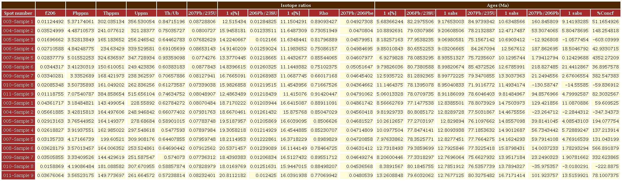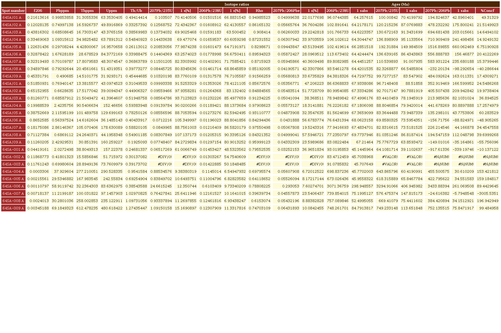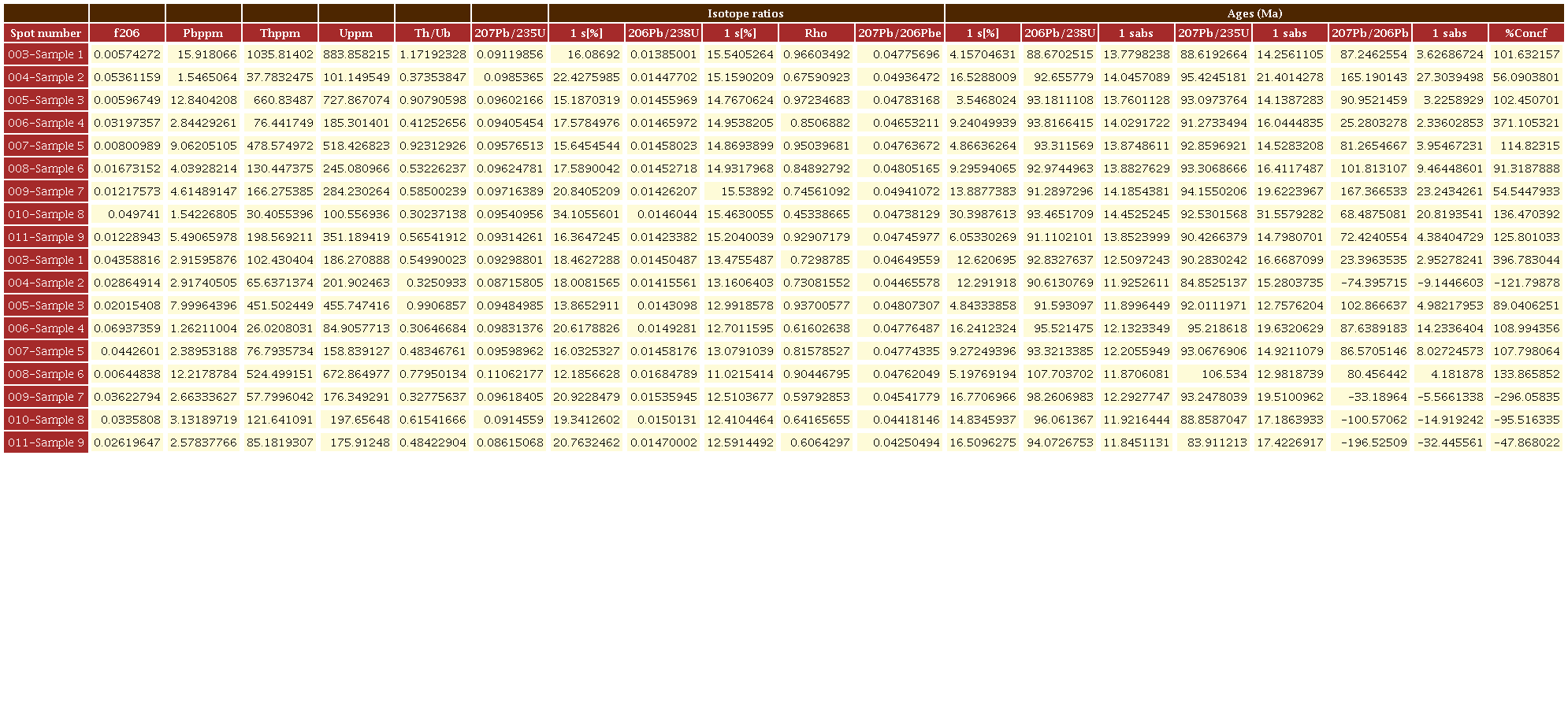 Por otro lado, el equipo SGC analizó 5 muestras por el mismo método U-Pb LA-ICP-MS en circones concentrados en el laboratorio químico del Servicio Geológico Colombiano sede Medellín, utilizando separación hidrodinámica y magnética. Los circones se seleccionaron manualmente con lupa binocular en el Laboratorio de Petrografía de la sede Medellín.