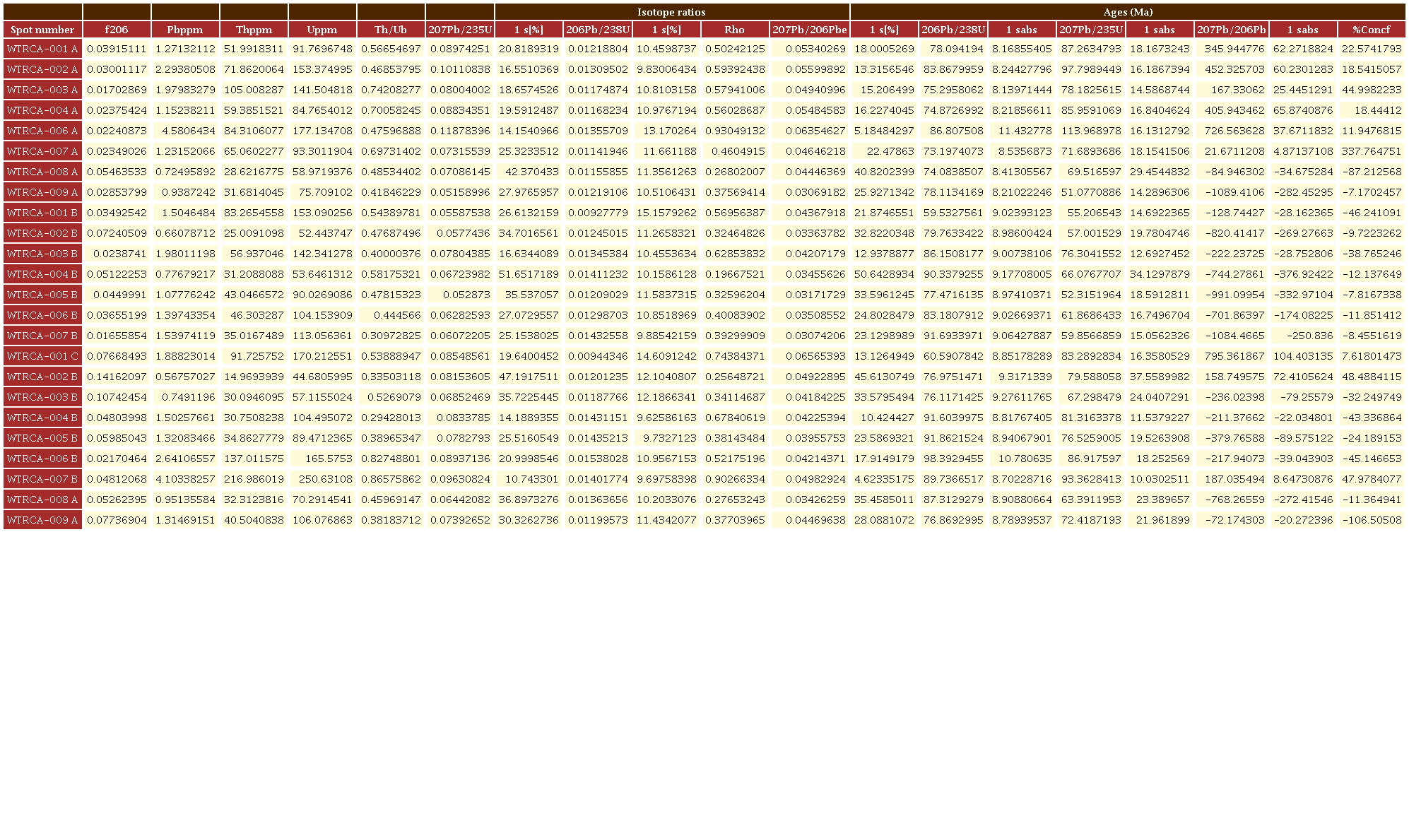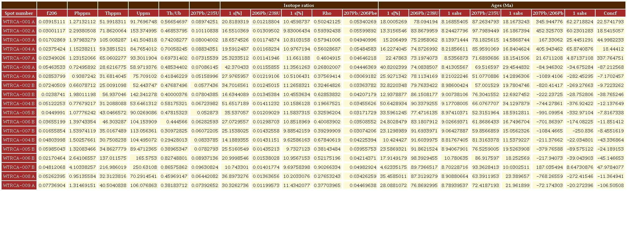 La muestra WTrCa (diorita) corresponde a una diorita con abundantes xenolitos de la Granulita de Pantanillo y cortada por diques asociadas al magmatismo terciario presente en la zona. En esta fueron analizados 19 circones con tamaños entre 100 y 300 µm y valores Th/U= 0.82-0.29, típicos de circones magmáticos (Rubatto, 2002; Figura 8), ígneos euhedrales, con crecimiento oscilatorio, cristalizados y sin núcleos heredados y una edad 206Pb/238U de 81.4 ± 2 Ma.