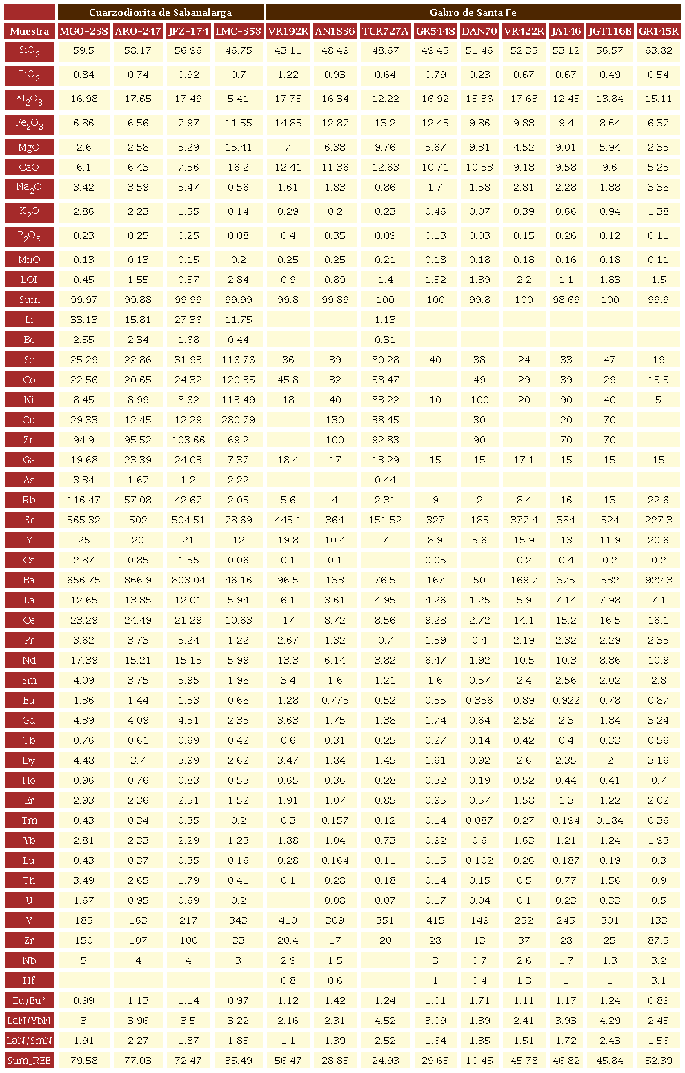 De este trabajo y de otros anteriores (Weber et al, 2015; Geoestudios, 2005; ver Tabla 1), se analizaron elementos mayores y trazas de 12 muestras distribuidas entre monzogranitos, tonalitas, cuarzodioritas y gabros de la unidad Cuarzodiorita de Sabanalarga y dioritas, tonalitas y microgabros, correspondientes al Gabro de Santa Fe. Las muestras se encuentran relativamente frescas con valores "Loss on ignition" LOI <2.8 para la Cuarzodiorita de Sabanalarga y LOI <1.8 para el Gabro de Santa Fe.