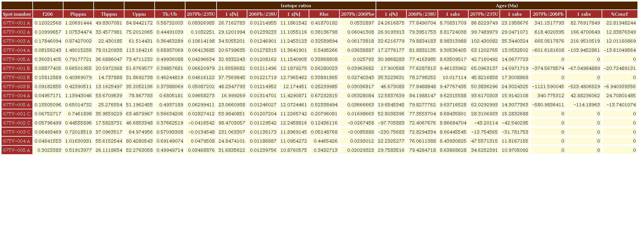 Para la muestra W67TR (tonalita), se analizaron 32 granos de circón, con tamaños que varían desde 200 hasta 400 μm, y valores Th/U=0.69-0.36 típicos de circones magmáticos (Rubatto, 2002). No obstante, debido a altas concentraciones de 206Pb, solo se consideraron los datos de 12 granos, los cuales permitieron calcular una edad de 74.6 ± 7.6 Ma (Figura 7).