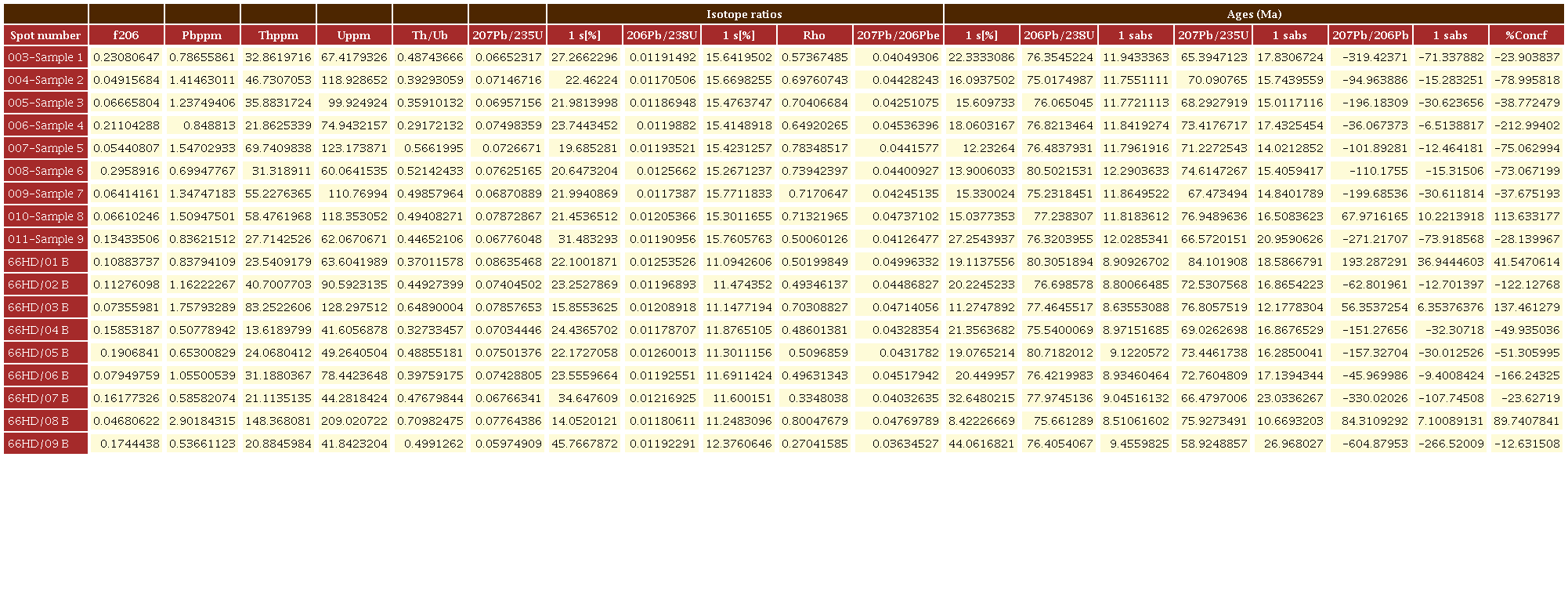 En la muestra W66HD (tonalita) se analizaron dieciocho granos de zircón, con tamaños entre 200 y 400 µm y valores Th/U= 0.64-0.29, típicos de circones magmáticos (Rubatto, 2002); mismos que permitieron calcular una edad de 76.7 ± 2.4 Ma (Figura 7). Los granos en esta muestra se presentan en dos poblaciones con errores y edades similares.