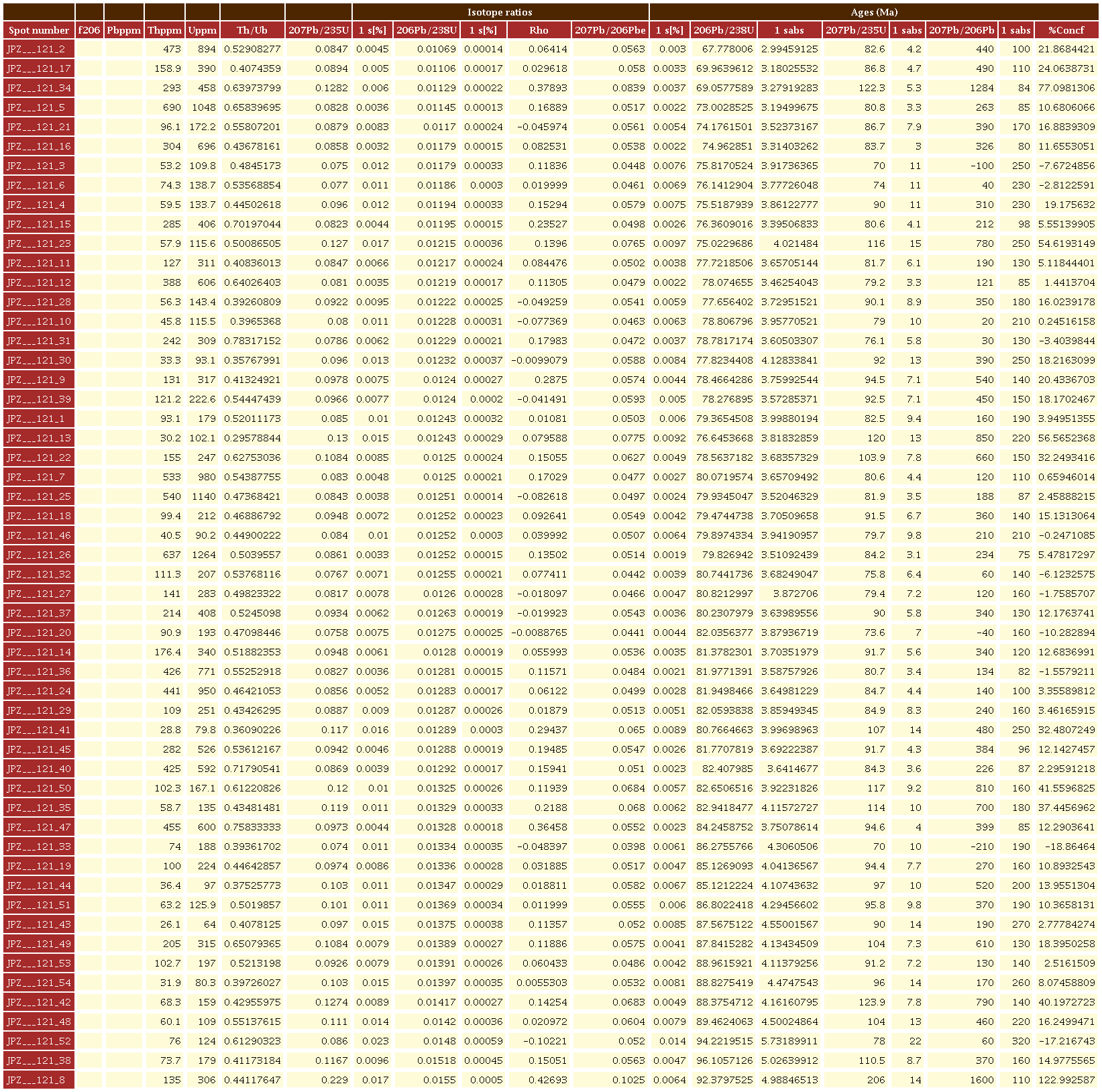 En la muestra JPZ-121 (tonalita hornblendica) fueron analizados 54 circones subhedrales a euhedrales, prismáticos cortos e incoloros, con tamaños entre 75 y 150 pm (Figura 8) y razones Th/U= 0.25-1.19, típicos de circones ígneos (Rubatto, 2002). El rango de dataciones obtenido varía entre 76 hasta 96 Ma en el diagrama Tera Wasserburg (Figura 8). Su edad fue calculada a partir de la relación 206Pb/238U en 79.71 ± 0.85 Ma (MSWD=1.09, n=18) (Figura 8).