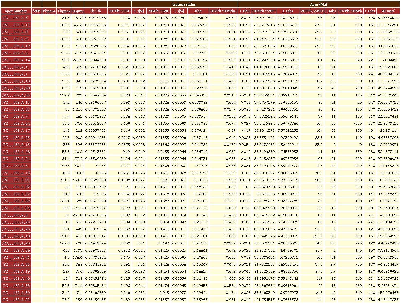 Para la muestra JPZ-159A (tonalita), se analizaron 25 circones subhedrales a euhedrales, prismáticos e incoloros, y algunos rotos con tamaños entre 50 y 150 μm (Figura 8). En las imágenes de CL se observa zonación oscilatoria. Las edades varían entre 86.9 a 88.3 Ma y son concordantes en el diagrama Tera Wasserburg (Figura 8). La edad media ponderada fue calculada 206Pb/238U de 86.7±1.6 Ma (MSWD= 2.6, n= 23), con valores U/Th= 0.9-0.78; valores típicos de circones ígneos (Rubatto, 2002).