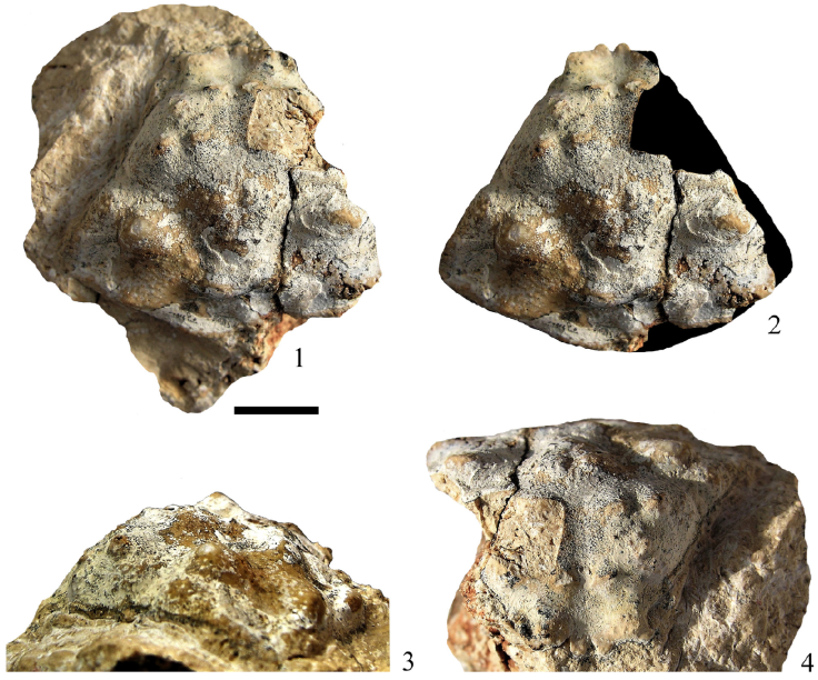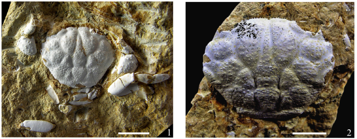 Diagnosis: Obovate, convex carapace, wider than long; narrow front, slightly downturned and axially depressed; round orbits having supraorbital margin with two narrow fissures; convex anterolateral margin with 7 spines; short, concave posterolateral margin with 6-7 spines; straight posterior margin; well-distinct dorsal regions with large, obovate or rounded crater-shaped lobules, surrounded by smaller tubercles.