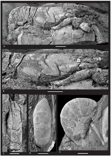 The cuticle on the holotype is strongly fractured in the branchial region and on the pleon, whereas that of the paratype is intact. In the posteroventral portion of the branchial region on the holotype, the exocuticle surface is generally dense whereas the surface of the endocuticle exhibits a fine reticulate pattern (Figure 2). The surface of the mold of the interior of the cuticle is granular.