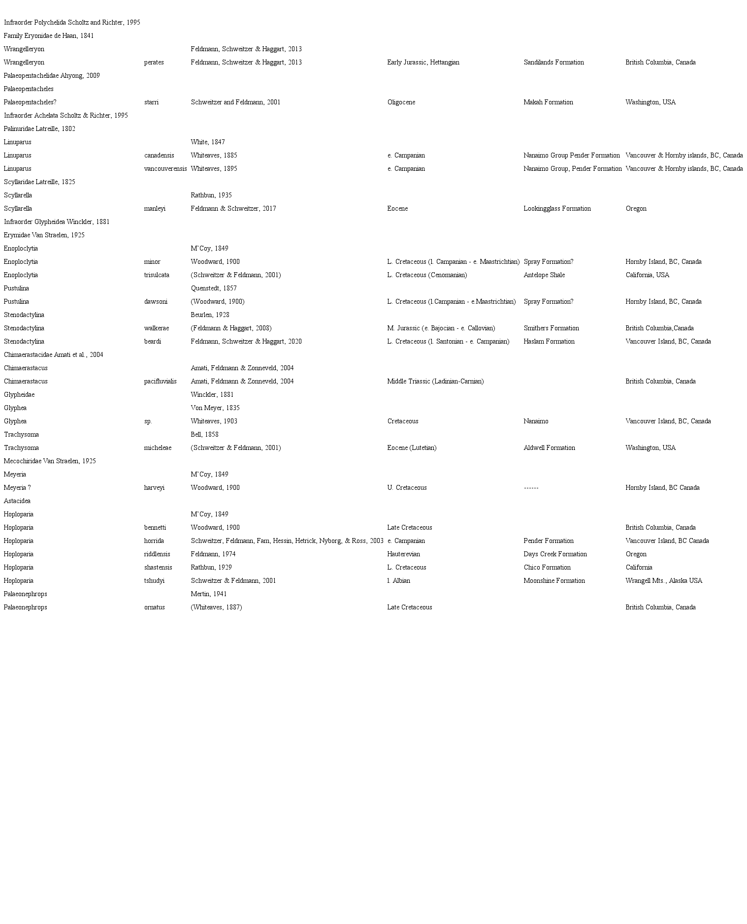 Feldmann, R.M., Schweitzer, C.E., Haggart, J.W., 2013, A new genus and species of lobster (Crustacea, Decapoda, Eryonidae) from the Early Jurassic (Hettangian) of British Columbia: Canadian Journal of Earth Science, 50, 135-141. https://doi.org/10.1139/cjes-2012-0120