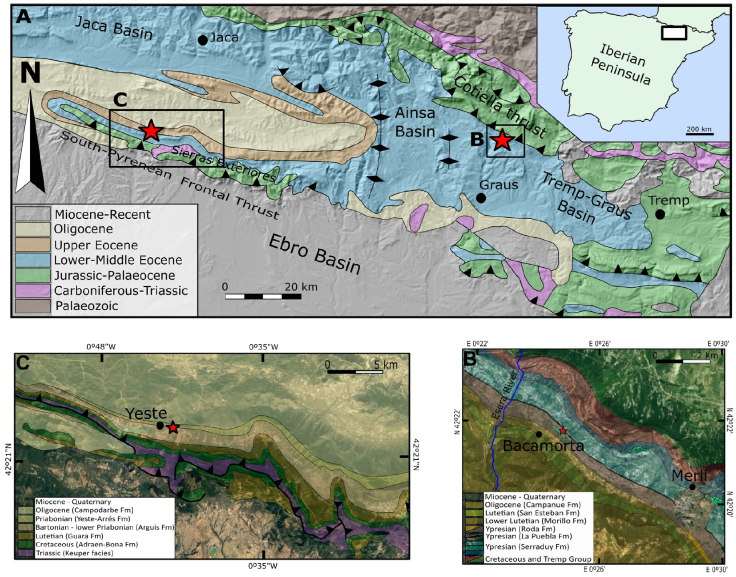 The material described herein comes from two outcrops (Figure 1A); one corresponding to lower Eocene (middle Ypresian) sandstones and marly beds, in the lower part of the Roda Formation (Cuevas-Gozalo et al., 1985) (Figure 1B); and the other one corresponding to upper Eocene (Priabonian) sandstones and marly beds, in the upper part of the Arguis Formation (Millán et al. 1994; Silva-Casal et al., 2017) (Figure 1C).