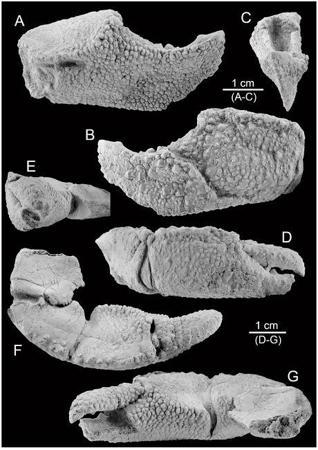 We can exclude the belonging of the new genus to PetrochirusStimpson, 1858 having the right cheliped bigger than the left (McLaughlin, 2003). The right chela seems similar. However, the fossil species of Petrochirus need to be revised (Bermúdez et al., 2017; De Angeli and Caporiondo, 2017; Vega et al., 2008) since most of them were erected based upon very fragmentary material or just because a superficial appearance due to the dense and characteristic squamose ornamentation.