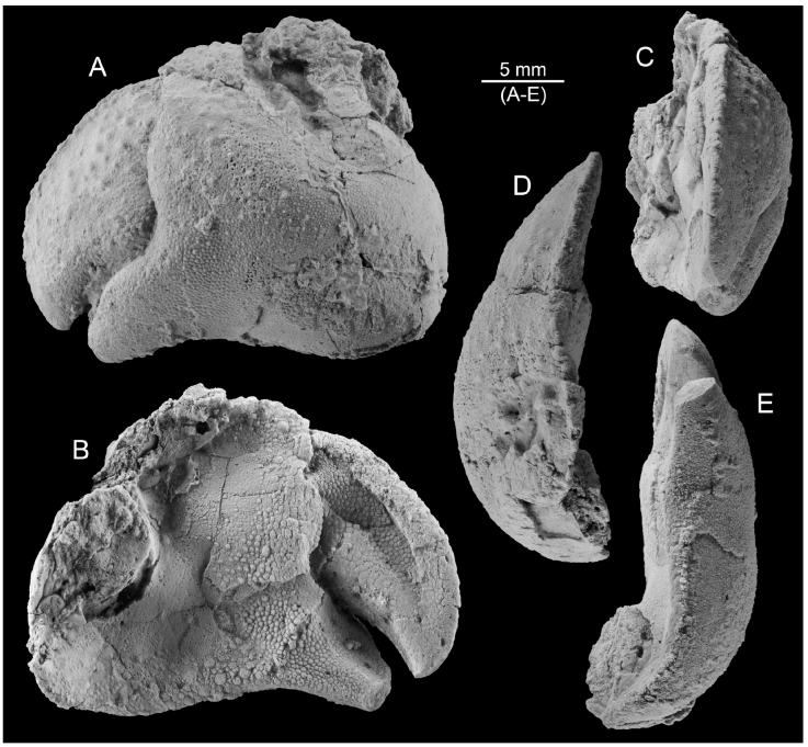 The lower Eocene material was collected from the “Barranco de Bacamorta” in the neighbourhood of the village of Bacamorta, in northeaster Huesca province, Aragón, Spain (coordinates 42º21’48”N, 0º24’56”E). The Roda Formation includes highly fossiliferous intervals, which have provided an important assemblage of decapods; Zanthopsis dufuorii (H. Milne Edwards in d’Archiac, 1850), Periacanthus ramosusArtal and Castillo, 2005, Eosymethis aragonensisVan Bakel, Guinot, Artal, Fraaije and Jagt, 2012, Collinscarcinus obliquesulcatusArtal and Van Bakel, 2020, Archaeoportunus isabenensisArtal, Ossó and Domínguez, 2013, Gaudipluma bacamortensisArtal, Van Bakel, Fraaije and Jagt, 2013, have been previously documented. The material was collected from the upper portion of the beds bearing Gaudipluma bacamortensis in limestones of the Roda Formation, near to Bacamorta.