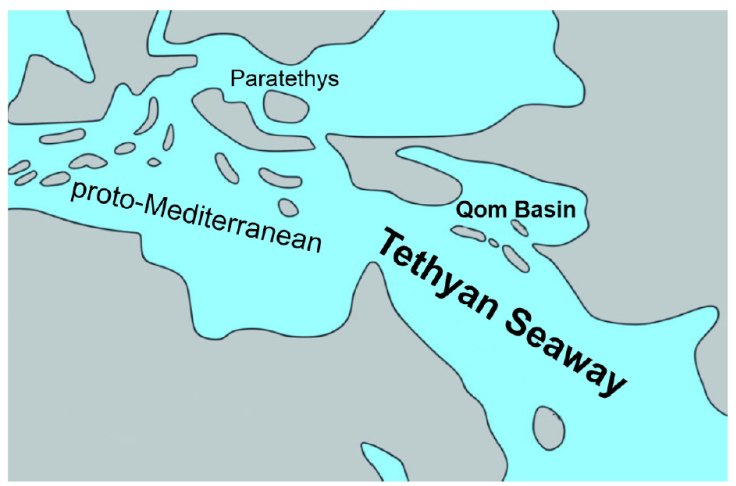 Marine sedimentation of the Qom Formation began during the Oligocene and continued to the end of the early Miocene in the Isfahan-Sirjan fore-arc and in the Qom back-arc basins (Schuster and Wielandt, 1999). The timing of opening and closure of the Tethyan Seaway (especially in the fore-arc and back-arc basins) is still being debated. Bozorgnia (1966) believed that the Qom Sea (Qom back-arc basin) persisted from the Rupelian (early Oligocene) to the Burdigalian (late early Miocene). Schuster and Wielandt (1999) also mentioned that in both foreland basins (Sanandaj-Sirjan and Central Iran), the marine sedimentation began during the early Oligocene and continued until the end of the early Miocene. However, Berning et al. (2009), suggested that during the late Oligocene, the narrowing Tethyan Seaway formed a connection between the Eastern Tethys and the Western Tethys regions.