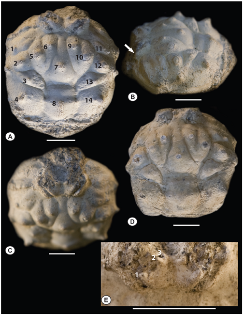 Description: Carapace subcircular, weakly vaulted transversely and longitudinally, length about 96 percent maximum carapace width; regions strongly inflated, delineated by deep grooves; carapace surface granular, almost pustulose on tubercles and frontal region, remainder of surface smooth; rostrum tridentate, densely granular, axially depressed, ending in two small, sharp, triangular spines directed forward (see Figure 2E: spine 3); pair of spines on either side, rounded, triangular, sharp, laterally directed, separated from medial spines by shallow U-shaped notch (see Figure 2E: spine 2); inner-orbital spines large, rounded, inflated, separated from adjacent spines by a deep U-shaped notch (see Figure 2E: spine 1); frontal width about 15 percent maximum carapace width; orbits deep, longitudinally narrow; outer-orbital spine broadly triangular, weakly projected; fronto-orbital width occupying 35 percent maximum carapace width; anterolateral margin strongly convex nearly vertical, fringed with minute granules; anterolateral margin with two rounded spines, one situated along lateral margin of sub-hepatic region, second one along lateral margin of epibranchial region; smooth posterolateral margin rounded, tapering posteriorly; posterior margin medially concave, rimmed; subhepatic and suborbital regions inflated, separated by deep grooves; subhepatic ridges with a row of small tubercles, directed axially, weakly curving forward; small, rectangular hepatic region, transversely elongate, separated by sinuous, deep groove posteriorly and divided by shallow groove; anterior and axial portion largest with longitudinally inflated tubercle; small posterior portion with small, rounded tubercle; epigastric region transversely depressed, poorly defined; groove extends transversely, ending at base of outer-orbital spine; protogastric region longitudinally inflated, weakly triangular rounded, divided in half by a shallow, narrow, longitudinal groove, directed axially; protogastric region with one rounded, anterior tubercle and one posterior tubercle slightly larger than anterior one; triangular-shaped mesogastric region, narrow anteriorly, wider posteriorly with an axially median rounded tubercle; smooth depressed metagastric region with two deep gastric pits; rectangular urogastric region inflated only about half as much as other axial regions, defined by posterior depression and anterior and lateral grooves; rounded, weakly sub-pentagonal cardiac region; anterior transversely ridged with one median turbercle axially situated on anterior margin of region; granules on and axially of cardiac tubercle; intestinal region strongly reduced, not well differentiated; epibranchial region divided in two parts by deep groove; anterior separated by deep cervical groove; posterior by deep, narrow branchiocardiac groove; anterior portion quadrate, strongly inflated, with one large, rounded, median tubercle; triangular-shaped posterior portion, strongly inflated with one median tubercle; mesobranchial region with one median tubercle; smooth metabranchial region; sternum and appendages not preserved.