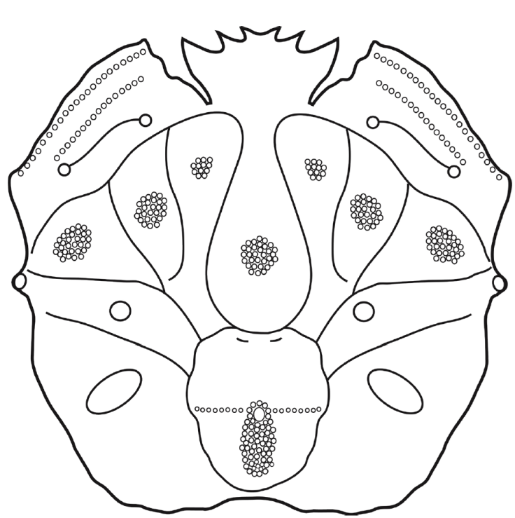 Diagnosis: Carapace subcircular and gently convex in both direction; rostrum tridentate, densely granular, axially depressed, ending into two small, sharp, triangular teeth forward directed; regions well defined and strongly inflated with 14 tubercles; anterolateral margin fringed with minute granules; smooth posterolateral margins.