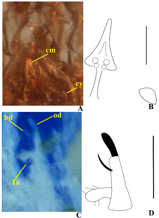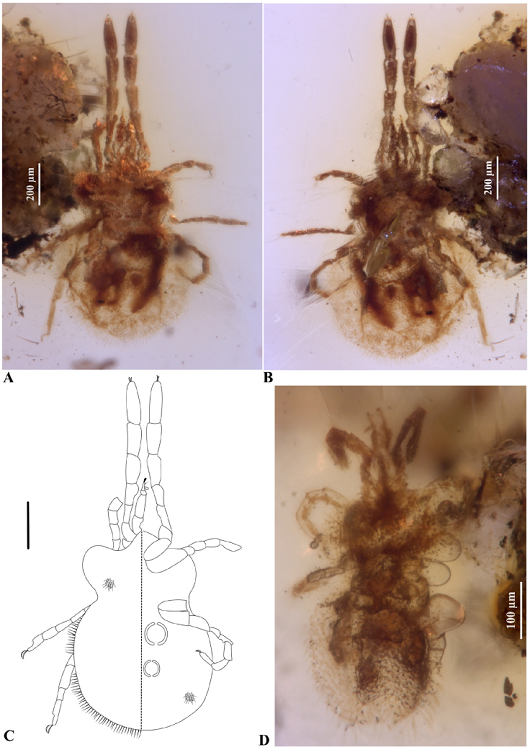 Descripción: Adulto: contorno del idiosoma tipo trapezoidal, aunque con el extremo posterior redondeado y ligeramente constreñido a la altura de las patas III (Figuras 1A a 1C), largo del idiosoma 870 µ y ancho máximo 605 µ. El primer par de patas más largo que el resto. Sedas espiniformes. Scutum triangular en la parte anterior y elongado en la posterior (Figura 2A). Crista metópica delgada y alargada con dos áreas de redondeadas presumiblemente de inserción de sedas (Figuras 2A y 2B). En la porción medía del idiosoma, el ejemplar se encuentra un poco maltratado por lo que da una apariencia asimétrica sobre todo al tratar de ubicar las áreas genital y anal (Figura 1C), en el caso de la primera (largo aproximado de 100 µ) débilmente distinguible a diferencia de la segunda. La quetotaxia de los pedilpalpos no es visible, a excepción del tarso donde se distinguen alrededor de cinco sedas largas que podrían ser eupatidios y en la tibia el odonto y el basidonto, este último mucho más delgado que el primero, tarso perpendicular a la tibia (Figuras 2C y 2D). Largo de los artejos del pedipalpo (Ta 23 µ, Ti 75 µ, Ge 32 µ, Fe 56 µ); largo del odonto (19 µ) y del basidonto (12 µ), distancia entre el odonto y basidonto (11 µ). Largo de los artejos de las patas: Leg I (Ta 160 µ, Ti 120 µ, Ge 110 µ, Tf 75 µ, Bf 25 µ, Tr 67 µ, Cx 120 µ); leg II (Ta -, Ti 90 µ, Ge 66 µ, Tf 68 µ, Bf-Tr 75 µ, Cx 97 µ); leg III (Ta-Tr 340 µ, Cx 95 µ); leg IV (Ta 170 µ, Ti 90 µ, Ge 85 µ, Tf-Tr 150 µ, Cx 120 µ). Largo de las sedas del idiosoma (10-15 µ).