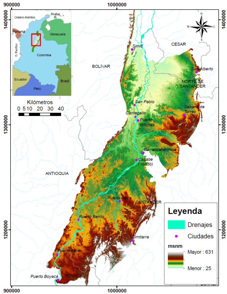 El SAVMM se encuentra ubicado en la cuenca sedimentaria del Valle Medio del Magdalena, abarca una superficie de 14913 km2 y se encuentra limitado por la Cordillera Central al occidente y la Cordillera Oriental al oriente como se aprecia en la Figura 1. El SAVMM se caracteriza por tener una topografía suave, con una elevación promedio de 186 msnm y máxima de 600 msnm. La dinámica fluvial de la zona es contralada por el Río Magdalena, principal corriente hídrica superficial del país. La zona de estudio tiene una temperatura media de 25.6°C, un régimen de precipitación bimodal, registrando precipitaciones medias de 2871 mm/año, una evapotranspiración potencial calculada mediante el método de FAO-Pennman Monthieth (Allen et al., 1998) de 1313 mm/año, registrando los mayores déficits hídricos en la zona norte del área de estudio.