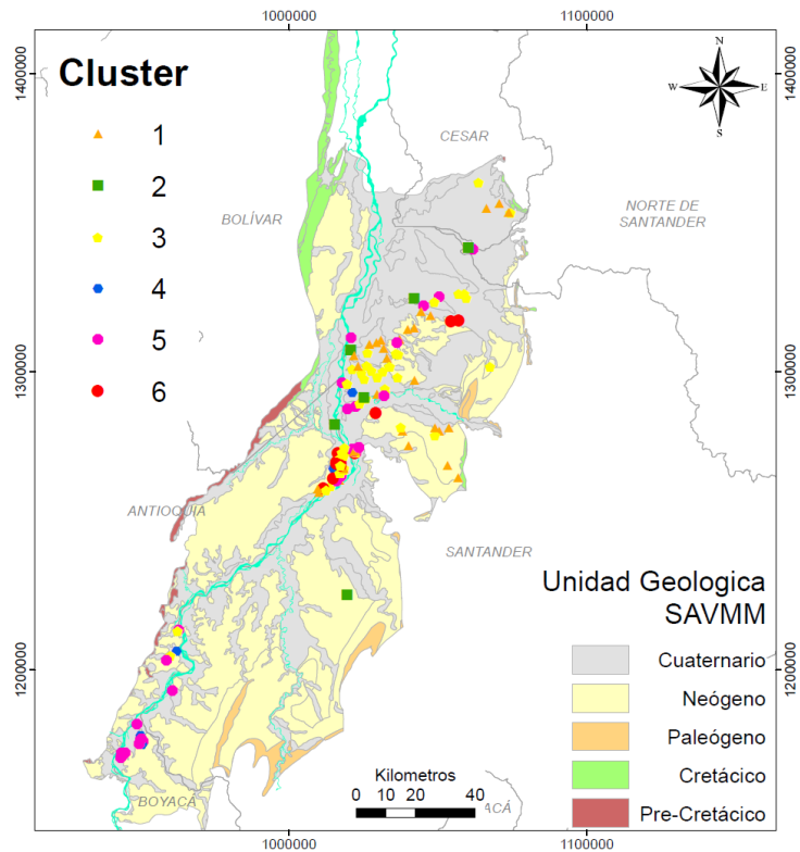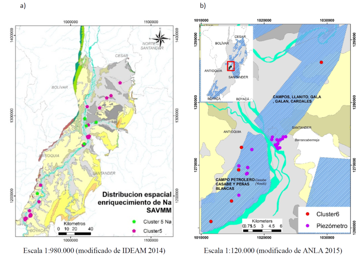 La cantidad y disponibilidad del agua subterránea en la región ha sido caracterizada gracias a los estudios hidrogeológicos realizados por las autoridades ambientales nacionales y regionales (IDEAM, 2013; 2014a). Sin embargo, el tema de calidad, y más concretamente los procesos geoquímicos que controlan la composición química del agua subterránea, están pobremente comprendidos. En el SAVMM se han realizado estudios puntuales que contienen información fisicoquímica para determinar la calidad del agua subterránea y determinar las facies hidrogeoquímicas (INGEOMINAS, 2002; Mejía, 2008). El tipo de agua predominante en el acuífero de los municipios de Puerto Berrío y Puerto Nare (que forman parte del SAVMM) fue determinada por Arismendy et al., (2003) y corresponde a agua del tipo bicarbonatada sódica y en menor proporción bicarbonatada cálcica. En 2013 se delimitó el SAVMM (IDEAM, 2013) y en 2014, el IDEAM presentó un análisis hidrogeológico de la zona, en el cual concluyó que el nivel de conocimiento del SAVMM no es suficiente para la gestión del agua subterránea (IDEAM, 2014a). Actualmente, sólo se han presentado resultados dispersos de informes de consultoría local, aproximaciones generales y puntales de la calidad y clasificación geoquímica, así como análisis fisicoquímicos dispersos de la calidad del agua subterránea, pero a la fecha no se han realizado estudios exhaustivos que incluyan el uso de técnicas estadísticas multivariadas para identificar y comprender los procesos geoquímicos que controlan la composición química del agua subterránea en el SAVMM. Por esta razón, con el fin de suplir esta deficiencia en el conocimiento hidrogeológico del SAVMM, en este trabajo se compilaron las caracterizaciones fisicoquímicas disponibles en los Estudios de Impacto Ambiental (EIA), Planes de Manejo Ambiental (PMA) e Informes de Cumplimiento Ambiental (ICA), presentados ante la Autoridad Nacional de Licencias Ambientales (ANLA), y por parte de las empresas interesadas en desarrollar proyectos de exploración y producción de hidrocarburos en el área de estudio.