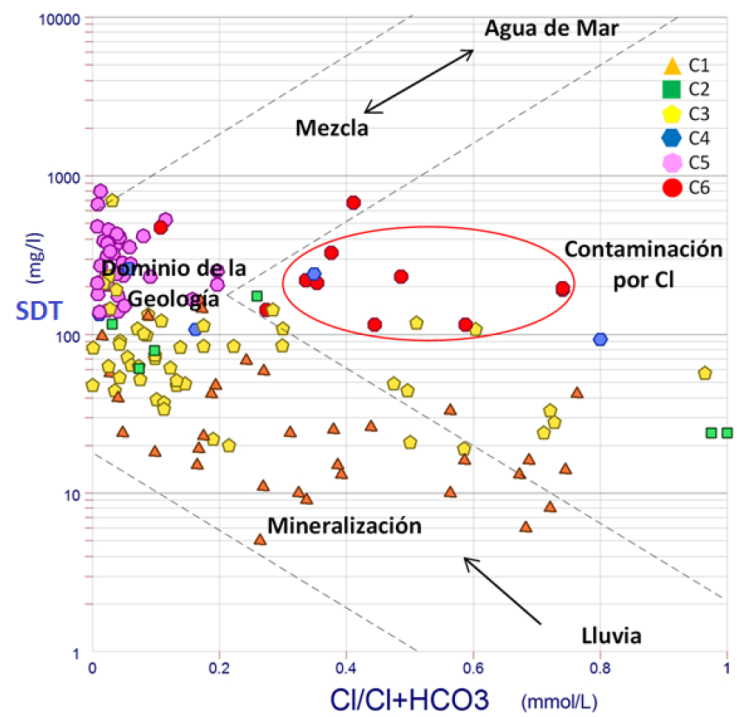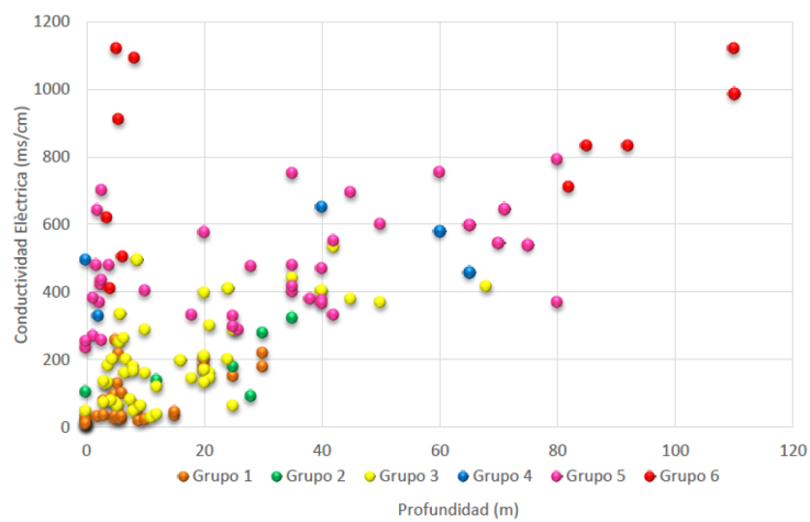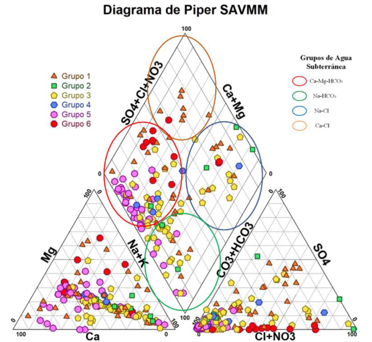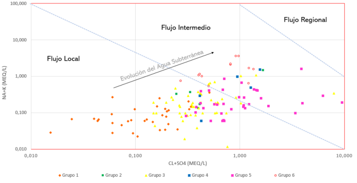 El grupo 1 corresponde al agua recién infiltrada en áreas de recarga, la cual es agua poco ionizada y corresponde a las muestras del tipo bicarbonatada cálcica. El grupo 5 representa el agua más ionizada, es de tipo bicarbonatada sódica y responde a agua subterránea más evolucionada dado que representa estratos más profundos, con mayor tiempo de residencia y tránsito a lo largo del área de estudio. Los grupos 2, 3 y 4 podrían corresponder a agua subterránea mixta o intermedia entre el grupo 1 y 5. Por otro lado, la geoquímica del grupo 6 es atípica, lo cual es explicado por un aporte de cloruro antropogénico.