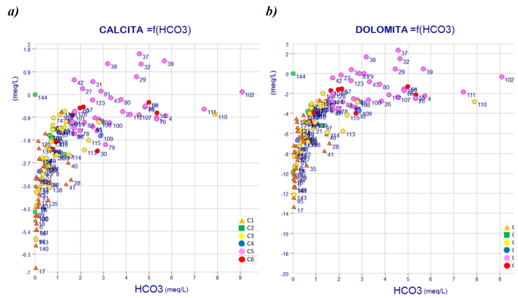 El proceso de disolución descrito se presenta en la Figura 12a y 12b, a través del programa PHREEQC (USGS, 2018) se estimaron los índices de saturación para la dolomita y la calcita con base en la composición química de las muestras. Con el análisis se puede inferir que la disolución es el proceso predominante y no la precipitación, a su vez se identifica que hay un mayor poder de disolución en los grupos 1, 2 y 3 que a la vez son los menos mineralizados y que las muestras más mineralizadas como las que están en el grupo 5 ya tienen menor capacidad de disolución debido a su mayor grado de saturación. Otra fuente probable de Ca2+ en el agua puede ser la alteración de piroxenos o anfíboles, presentes en los cuerpos ígneos que afloran en el área de estudio (Cañas et al., 2019).