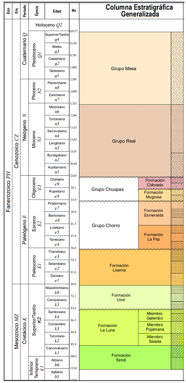El SAVMM se encuentra cubierto en un 95% por rocas sedimentarias divididas en 12 formaciones litoestratigráficas. Del mismo modo, se identificaron cuerpos litodémicos, para un total de 16 unidades litológicas en la parte occidental del área de estudio, pertenecientes a procesos tectónicos que dieron origen a la formación de la cordillera central, como son: el Batolito de Segovia y el Complejo Cajamarca. A continuación, se hace una descripción litológica de las unidades con principal interés hidrogeológico siguiendo la secuencia estratigráfica del SAVMM (Figura 3).