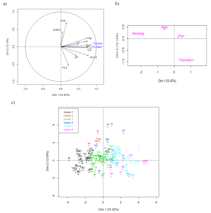 Los resultados del AAJ son consistentes con los resultados del ACP. Las muestras del grupo 1 están situadas en el lado medio-izquierdo del plano factorial y corresponden a las muestras menos mineralizadas, en su mayoría manantiales (Figura 6c) mientras que las muestras de los grupos 5 y 6 están situadas en el lado derecho y corresponden a las muestras más mineralizadas, en su mayoría conformadas por pozos y piezómetros. Las muestras de los grupos 2, 3 y 4 se encuentran en el centro del plano factorial y son las muestras con nivel intermedio de mineralización. En consecuencia, la distribución de las muestras en el plano factorial y de acuerdo con el círculo de correlaciones es de las menos mineralizadas: grupo 1 (lado izquierdo sentido contrario a las flechas del círculo de correlaciones); a las más mineralizada: grupo 6 (lado derecho y en dirección a las flechas del círculo de correlaciones), como se presenta en la Figura 6a.