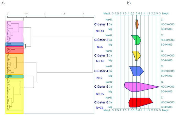 La clasificación de las muestras utilizadas en grupos se basa en una observación visual del dendograma (Gü̈ler et al., 2002). La posición de la línea fenotípica que cruza el dendograma permitió la conformación de 6 grupos que resumen la información química de las 140 muestras (Figura 7a). Los valores promedio para cada parámetro revelan alguna tendencia entre los grupos identificados. A partir de los valores medios de las concentraciones de cada grupo se realizó un diagrama de Stiff (Figura 7b) que permitió identificar diferencias y similitudes entre cada grupo. En la Tabla 4 se resume la conformación de los 6 grupos.