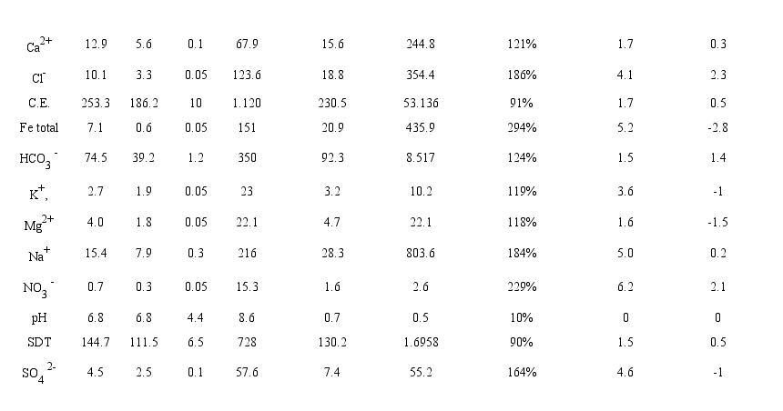 Posterior a esto y como procedimiento para asegurar la calidad de las muestras compiladas se calculó el valor de error analítico del balance iónico (Freeze et al., 1979), de manera que la suma de la concentración en miliequivalentes de cationes debe ser igual a la suma de las concentraciones en miliequivalentes de aniones, como se indica en la Ecuación 4.