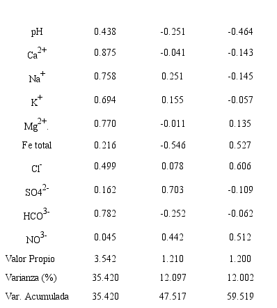 Para este estudio se tomaron los tres primeros componentes principales con valores propios mayores a 1 (Davis, 2002), los cuales explican el 59.4 % de la varianza total en el conjunto de datos (Tabla 3). Aunque la varianza acumulada para los tres componentes seleccionados no es alta, los resultados obtenidos pueden explicar con éxito las interrelaciones entre las variables. El componente principal 1 explica la mayor cantidad de la varianza con un 35.4% (Tabla 3) y se caracteriza por pesos positivos altos de los cationes Ca2+, Na+, K+, Mg2+ y el anión HCO3-. Los parámetros presentes pueden indicar procesos de alteración de silicatos presentes en la zona, dado que los iones representados por este componente son débilmente retenidos por la estructura silicatada, por lo cual, quedan fácilmente en solución. El componente principal 2 explica el 12% de la varianza total (Tabla 3) y está caracterizado por valores negativos, con altos pesos del SO42-. Este componente está asociado a actividades antrópicas presentes en la zona de estudio (centros poblados y agroindustria).