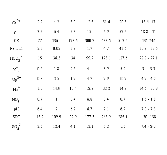 Para los grupos 2, 3 y 4 el diagrama de Stiff presenta formas similares que se van ensanchando del grupo 2 al 4 con los iones Na+ y HCO3- como dominantes. Por otra parte, el grupo 1 lo conforman las muestras de agua menos mineralizada y su forma corresponde a la mayor concentración de los iones Ca2+ y HCO3- (concentraciones de conductividad eléctrica promedio de 77 µS/cm). Los grupos 5 y 6 lo conforman las muestras de agua más mineralizada, se observa que en el grupo 5 los iones dominantes son Na+, Ca2+ y HCO3-, y en el grupo 6 los iones dominantes son el Ca2+, HCO3- y el Cl- (concentraciones de conductividad eléctrica promedio de 513.2 µS/cm).