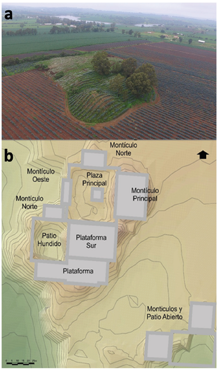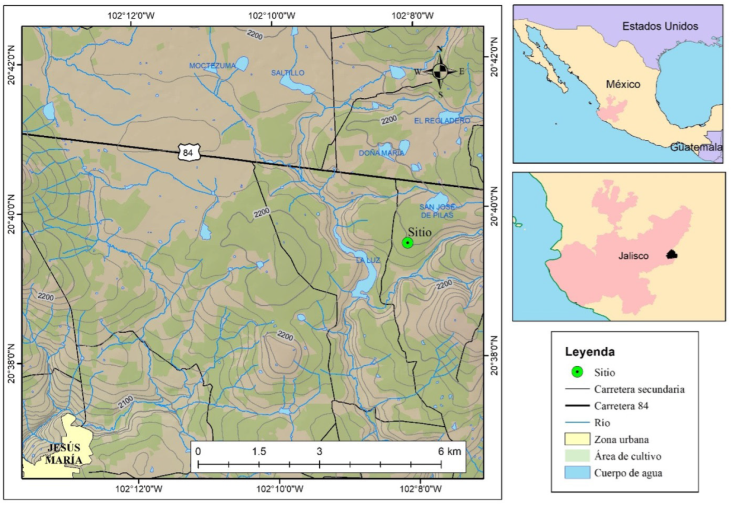 El Cerrito de Los Agaves está ubicado a unos 800 metros al norte de la comunidad conocida como La Luz, municipio de Jesús María, Jalisco y a unos 10 kilómetros (en línea recta) al noreste de la cabecera municipal (Figura 1). Este sitio es una de las tres áreas con vestigios prehispánicos que conforman el Proyecto Arqueológico Presa de La Luz, y es la única hasta el momento que cuenta con monumentos arquitectónicos. Está constituido en su área nuclear por un patio cerrado (Plaza Principal) de grandes dimensiones, cuenta con un con altar central y el patio es limitado al oriente por un montículo piramidal de aproximadamente 12 metros de altura, al sur por una gran plataforma rectangular que se eleva desde el piso del patio unos 4 metros (Plataforma Sur) y al poniente y norte por dos pequeños montículos unidos todos ellos por una banqueta.