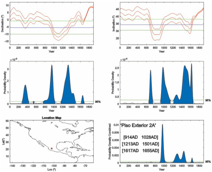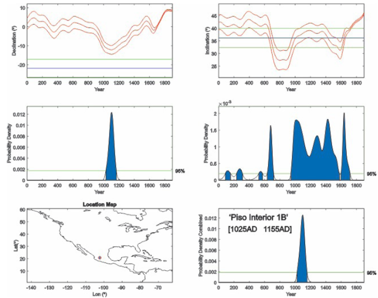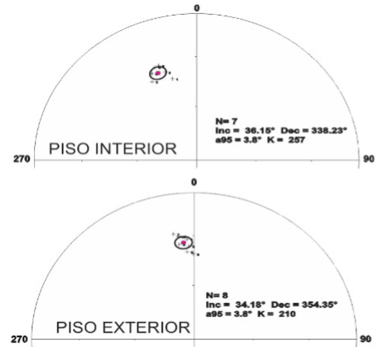 Aunque 20 especímenes fueron desmagnetizados mediante campos alternos, solo 15 de ellos (7 correspondiente a Piso Interior y 8 a Piso Exterior) mostraron una agrupación congruente y, por lo tanto, fueron considerados para el cálculo de paleodirecciones medias reportadas en la Figura 8. La datación arqueomagnética consiste en comparar estas direcciones medias con las que se esperan para la misma región y edad según el modelo geomagnético SCHA.DIF.14k (Pavón-Carrasco et al., 2014) utilizando el software archaeo_dating de Pavón-Carrasco et al., (2011). Los resultados del ejercicio de datación están reportadas en las Figuras 9 y 10.