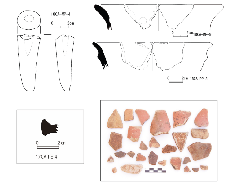 Asociado a estas características arquitectónicas, podemos observar también un patrón similar en los tipos cerámicos rescatados durante la primera temporada de excavación en el Cerrito de Los Agaves. Aunque fueron pocos los materiales diagnósticos recuperados hasta ahora, se aprecian tipos muy característicos del periodo Epiclásico como son los cajetes trípodes, algunos con dibujos incisos, las ollas con borde engargolado, así como algunos fragmentos de copas o copas pedestal (Figura 11).
