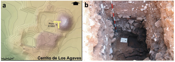 El inicio de los trabajos de investigación arqueológica de El Cerrito de Los Agaves se remonta al año 2017 en una primera temporada de 2 meses en campo en la que se realizaron los trabajos de topografía general, el trazo reticular del área de interés y la excavación de tres pozos de sondeo (Esparza, et. al., 2018).