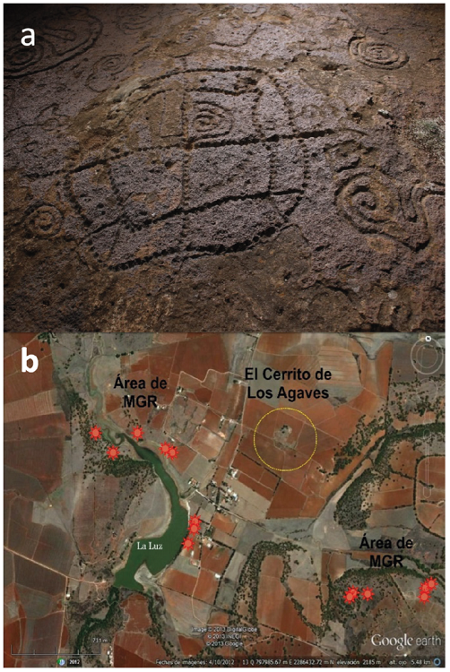 La razón principal por la cual se hacen las excavaciones en el complejo del Cerrito de Los Agaves es que las otras dos zonas de vestigios alrededor de este sitio están compuestas principalmente de concentraciones de Manifestaciones Gráfico Rupestres (MGR) o petrograbados, entre las que destacan las conocidas como cruces punteadas o pecked cross (Figura 4a y 4b), representaciones relacionadas con el conocimiento astronómico, cabe destacar que en este sitio existe una de las concentraciones más altas de este tipo de MGR solo después de Teotihuacán en el estado de México y Xihuingo-Tepeapulco en el estado de Hidalgo (Esparza et. al., 2016).