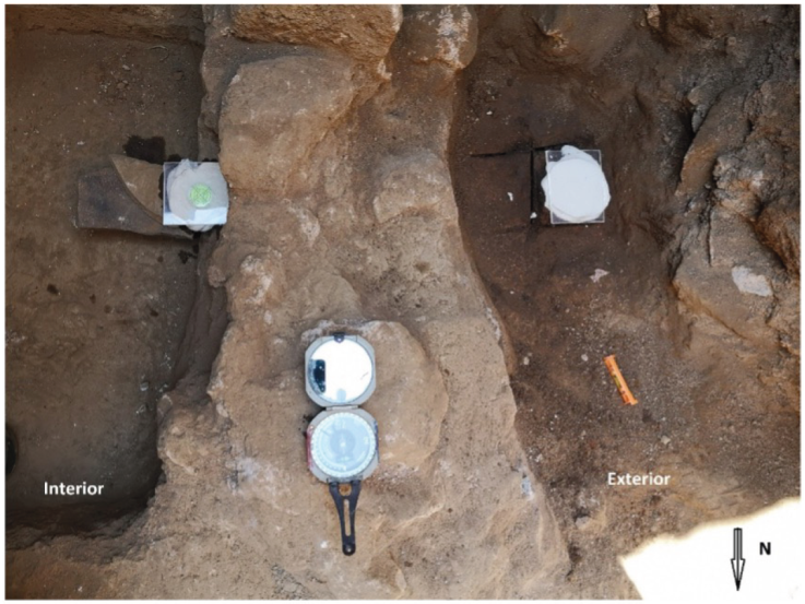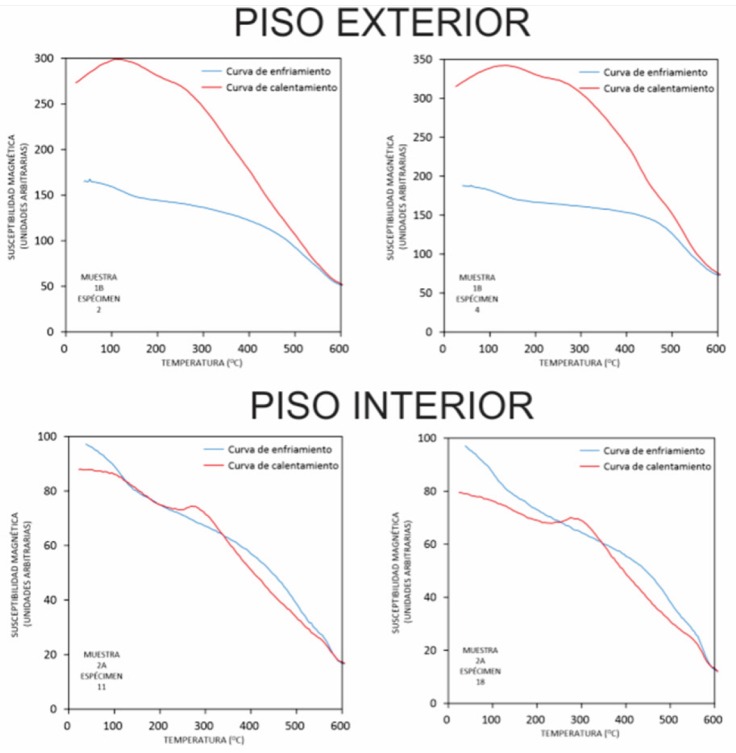 Las muestras de mano arqueomagnéticas fueron tomados dentro de Pozo S12E2, en una profundidad aproximada de 4 metros. Los pisos aparentemente quemados y separados por un grueso muro (Figura 5) obteniéndose muestras orientadas magnéticamente del piso interior como del exterior. Con la finalidad de identificar la mineralogía magnética presente en los materiales estudiados se realizaron experimentos de susceptibilidad magnética en función de temperatura (Figura 6). Las temperaturas de Curie de las curvas termomagnéticas se determinaron mediante el método de Prévot et al., (1983). Todas las muestras estudiadas provenientes del piso exterior muestran un comportamiento termomagnético inestable marcados por una clara irreversibilidad de curvas de calentamiento y enfriamiento. Sin embargo, se aprecia que una sola fase ferromagnética, probablemente titanomagnetita pobre en titanio está presente. No es el caso para las muestras de piso interior donde se observan claramente dos fases magnéticas durante el calentamiento. La fase observada entre 250ºC y 350°C desaparece completamente después de calentamientos de hasta 600°C lo cual podría ser indicativo de la inversión de titanomaghemita y su transformación hacia magnetita (Dunlop y Özdemir, 1997; 2015). A cada muestra le fue medida la magnetización remanente natural (NRM por sus siglas en inglés) utilizando un magnetómetro de giro AGICO JR6A.