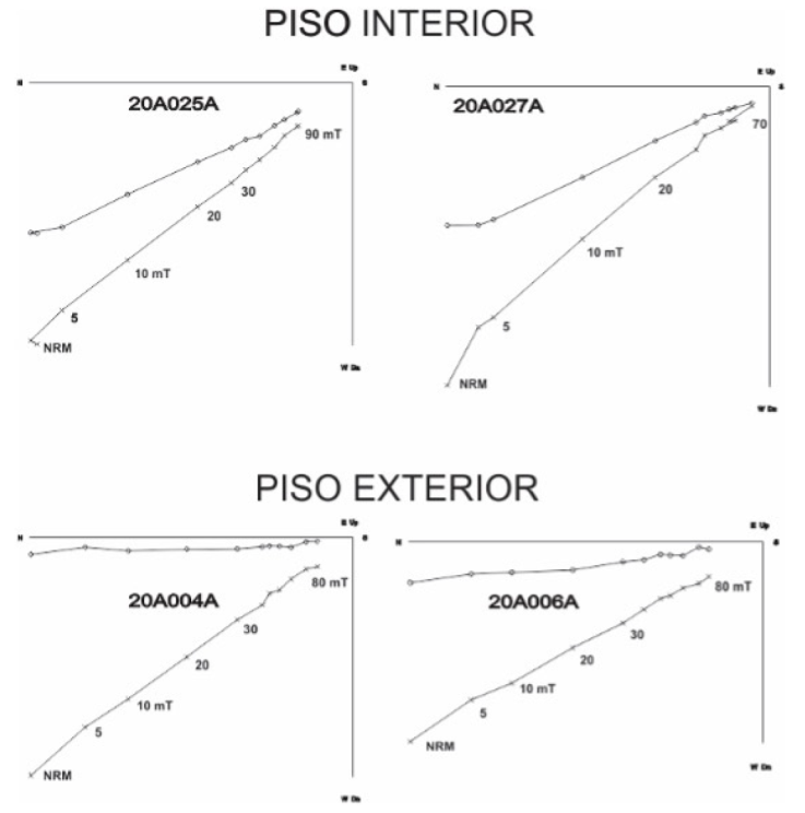Posteriormente las muestras fueron desmagnetizadas mediante la aplicación progresiva de campos magnéticos alternos (AF por sus siglas en inglés) aplicando campos con valores pico de hasta 90 mT (Figura 7). La dirección de la magnetización remanente característica (ChRM) de todas las muestras se determinó mediante el análisis de componentes principales (Kirschvink, 1980) con al menos cuatro datos de los tratamientos magnéticos. Las direcciones medias para las muestras de piso se calcularon siguiendo la estadística de Fisher (1953) que incluyen el parámetro de precisión (k) y el ángulo de confianza (α95). En total se desmagnetizaron 20 muestras de ambos pisos quemados. En la Figura 7 se muestran los ejemplos más representativos. Se aprecia esencialmente una única componente de magnetización con tendencia lineal al origen de coordenadas en los diagramas ortogonales lo cual indica que fue posible aislar las componentes características de las muestras. Las magnetizaciones secundarias de origen viscoso tienen una contribución poco significativa y son fácilmente removidas en las primeras etapas de desmagnetización con campos de 10 mT.