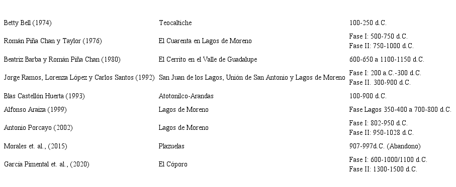 En la Tabla 1 también se pueden observar otros fechamientos de Los Altos de Jalisco, los cuales en su mayoría son muy similares a los que tenemos para el sitio de El Cerrito de Los Agaves. Cabe mencionar que los primeras siete son por Carbono 14 y las últimas 3 son mediante datación arqueomagnética.