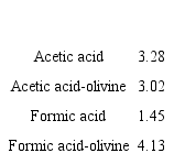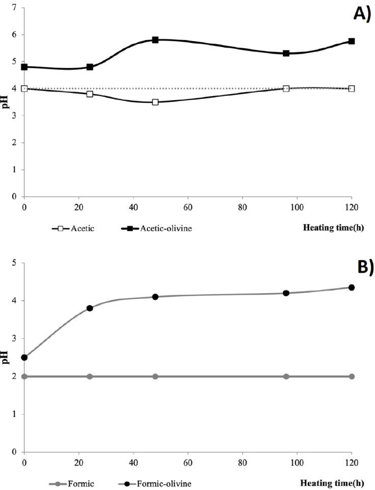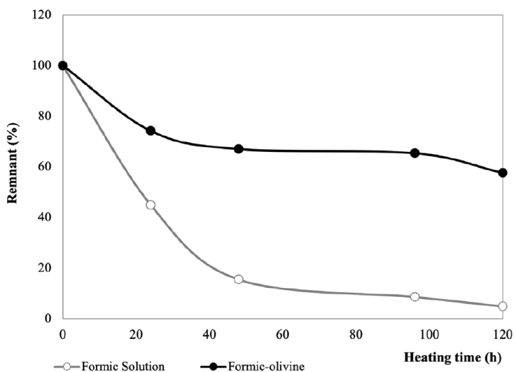 Effect of the mineral on thermolysis of the organic acids. There is also an effect of mineral in the decomposition of both acids. In both systems, olivine induces less decomposition; in the case of acetic acid the recovered acid was 46 %; and in the case of formic acid, 57 % of the organic acid was recovered after heating. Even if the exact mechanism is not known, olivine affects decomposition.