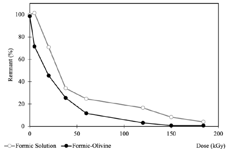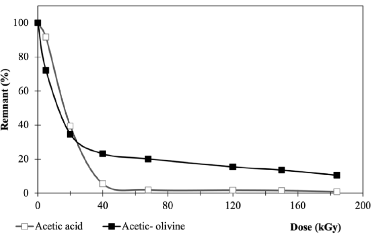 Acetic acid radiolysis. In the case of acetic acid, as dose increases decomposition of the molecule also does. At 185 kGy (the higher dose) the acetic solution shows the maximum decomposition, and only 0.85 % of the acid was recovered. In the case of the system including olivine the amount recovered is higher at the same dose, and 10 % is recovered (Figure 2).
