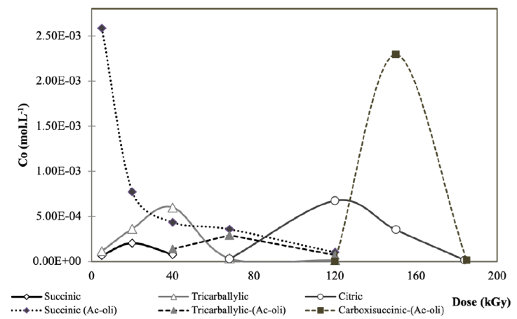 Acetic acid. The interaction of radiation with acetic acid induces a highly decomposition of the molecule and it has been well studied (Burr, 1957; Neta, et al., 1969; Lukáč et al., 1972; Josimović and Draganić, 1973; Josimović et al., 1976). Decomposition of this acid leads mainly to the formation of other carboxylic acids, among them: succinic, malonic, tricarballylic, citric, isocitric, beta hydroxyl-betamethylglutaric, and aconitic (Neta et al., 1969; Josimović and Draganić, 1973; Navarro-González et al., 1990; Criquet and Leitner, 2011). In this research succinic, malonic, tricarballylic, and citric acid were identified at low concentrations (up to 10-4 mol.L). All these organic molecules are involved in one of the most important metabolic pathways for living beings, the Krebs cycle. Therefore they are relevant compounds for understanding the evolution of organic molecules on early Earth (Negrón-Mendoza and Ponnamperuma, 1976; Negrón, 1980; Gordeev et al., 2007).