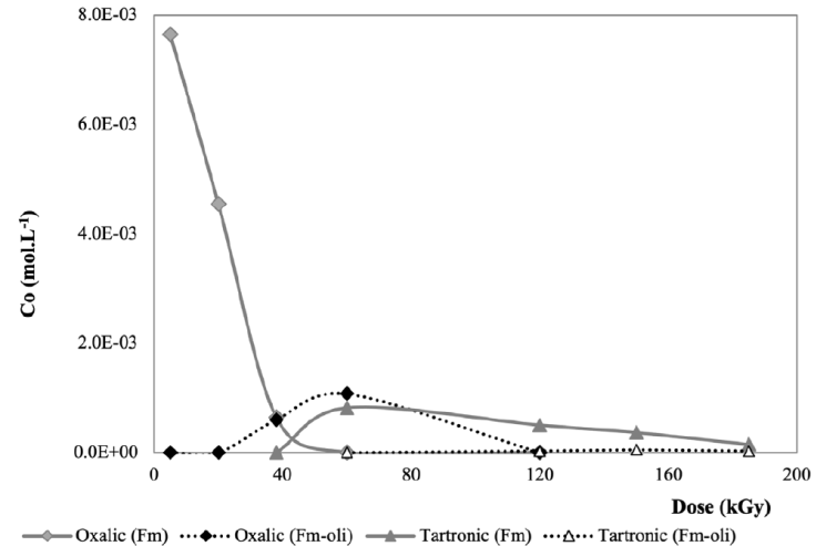 Criquet and Leitner (2011) studied the radiolysis of acetic acid at variable doses up to 5 kGy. These authors highlight that pH has an effect in decomposition; at pH 4.5 the greatest degradation was observed due to the reaction rate constant between acetate and hydroxyl radicals. Interestingly, in the system studied by Criquet and Leitner (2011) they suggest that acetic acid is attacked mainly by the hydroxyl radical. This reaction could produce oxalic acid, which is extremely reactive and difficult to detect in such system (Carota et al., 2015; Botta et al., 2017).