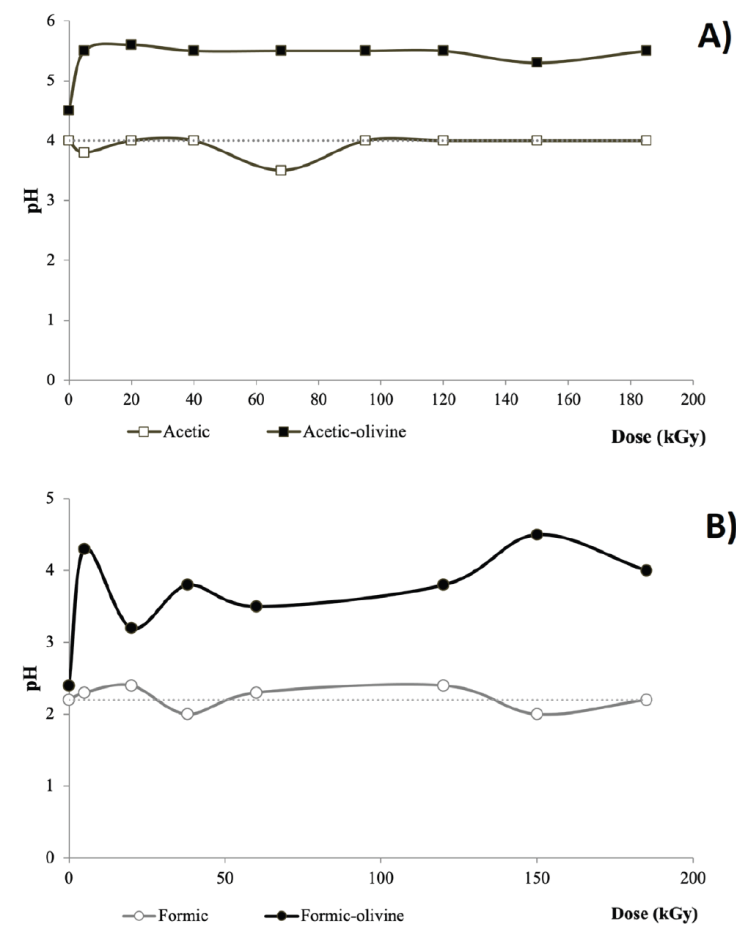 pH variation. Differences on pH values bring us some clues about the chemical changes in the irradiated samples. In Figure 6 the pH values are shown for all studied systems. All olivine bearing samples show a pH increase. After irradiation, some samples show small pH variations. In the case of acetic acid solutions, there is a decrement in pH after irradiation. For formic acid, a slightly increment is noticeable.