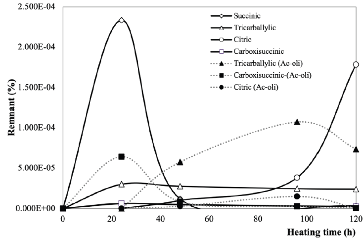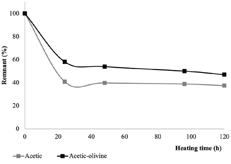 Acetic acid thermolysis. The heating of samples at 95 °C produced the decomposition of acetic acid, in both free solutions, and in presence of the mineral (Figure 7). After 120 h of heating, 37 % of the acid is recovered in samples that contained only acetic acid; while the presence of olivine produces a minor decomposition; and at the same heating time, 46 % of the acid was recovered.